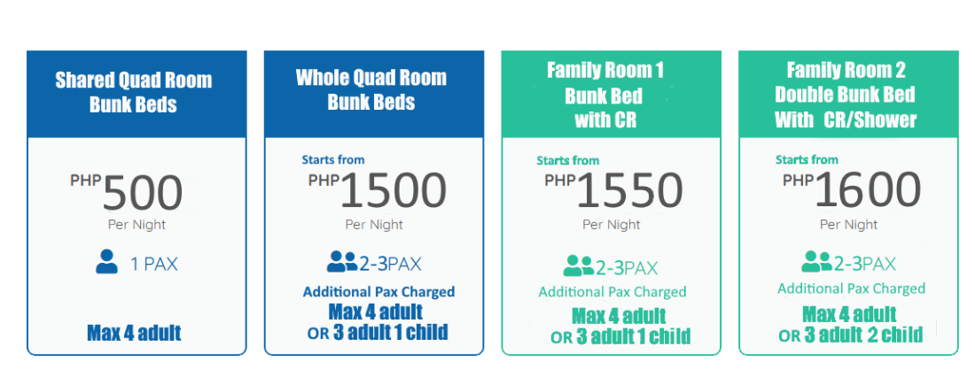 - A one time Booking Fee of PHP500 is required to make reservation. This fee is to cover the administration, maintenance and operating of the homestay